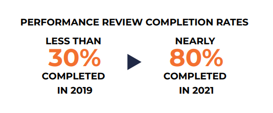 The attitude and message around performance reviews is completely different than it was when they first started out. At first, managers were disconnected from the process. After one short year, they now rely on the insights that performance reviews can provide. They’re asking, “Can you tell me how my organization is doing? What percentage of completion do we have?” As a result, performance review completion rates have made a complete turnaround, going from less than 30% completed in 2019 to nearly 80% in 2021.