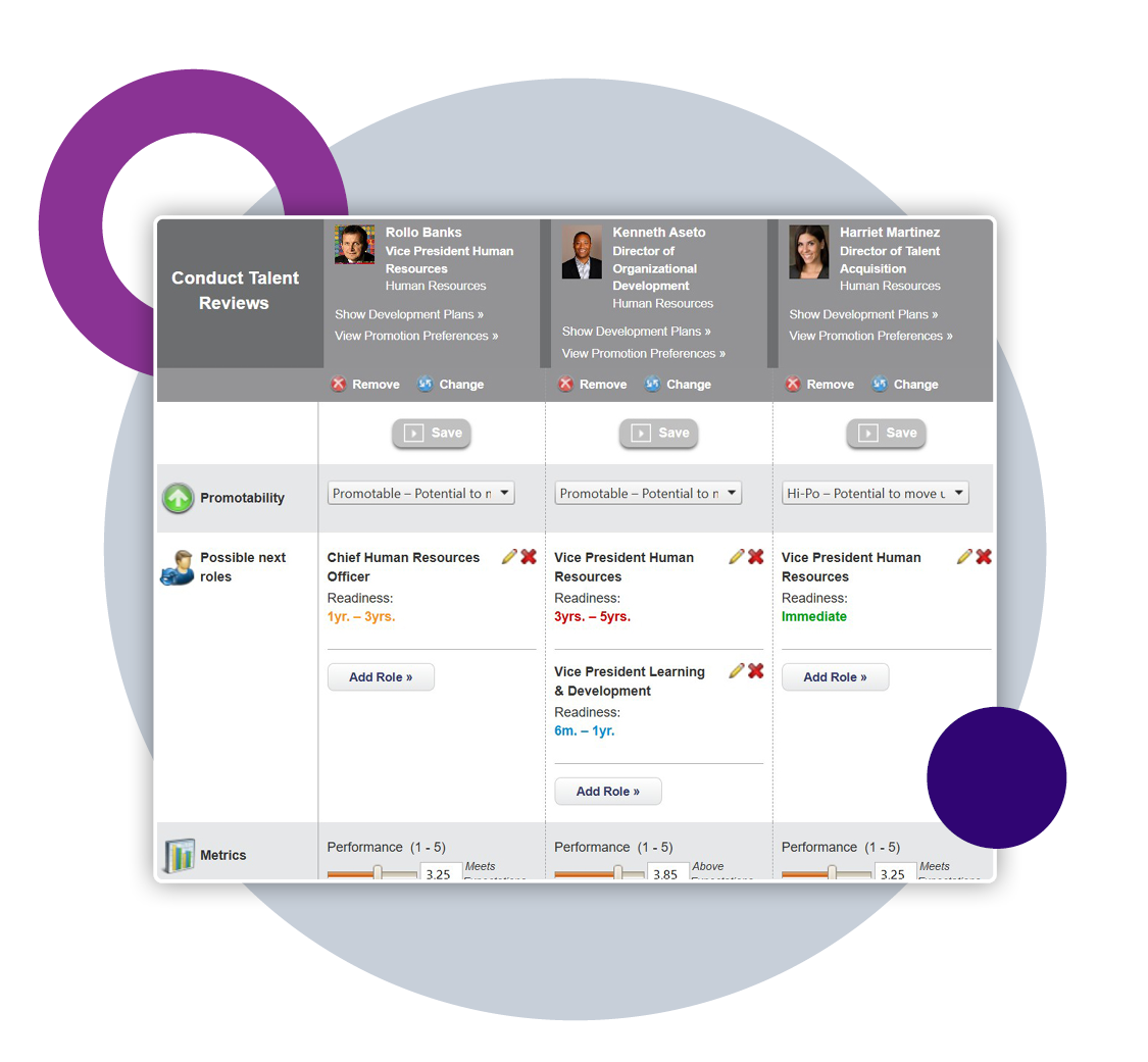 Spot high-potential talent early and document succession paths with confidence. Compare employees side-by-side and note realistic next roles so your talent decisions are consistent and aligned to future business needs.