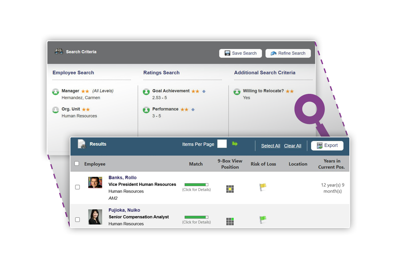 Find the right people for the right opportunities by searching across skills, education, performance, tenure, and more — then sharpen results with weighted scoring plus exact or partial matching to quickly surface right-fit internal candidates for key roles, internal moves, and targeted development.
